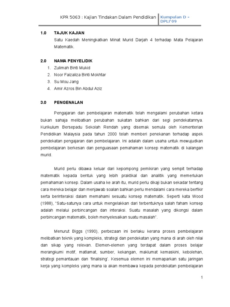 Kajian Tindakan Satu Kaedah Meningkatkan Minat Murid Darjah 4 Terhadap Mata Pelajaran Matematik Pdf